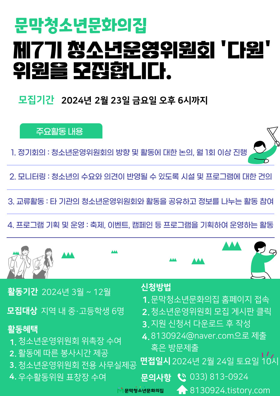 | 문막청소년문화의집 청소년운영위원회 '다원' 7기 모집 (1) | 2024.01.11 |