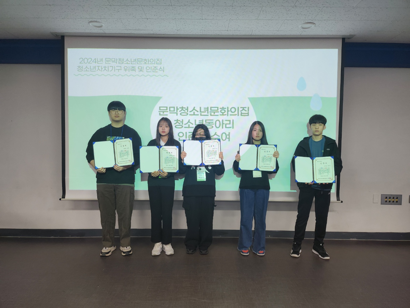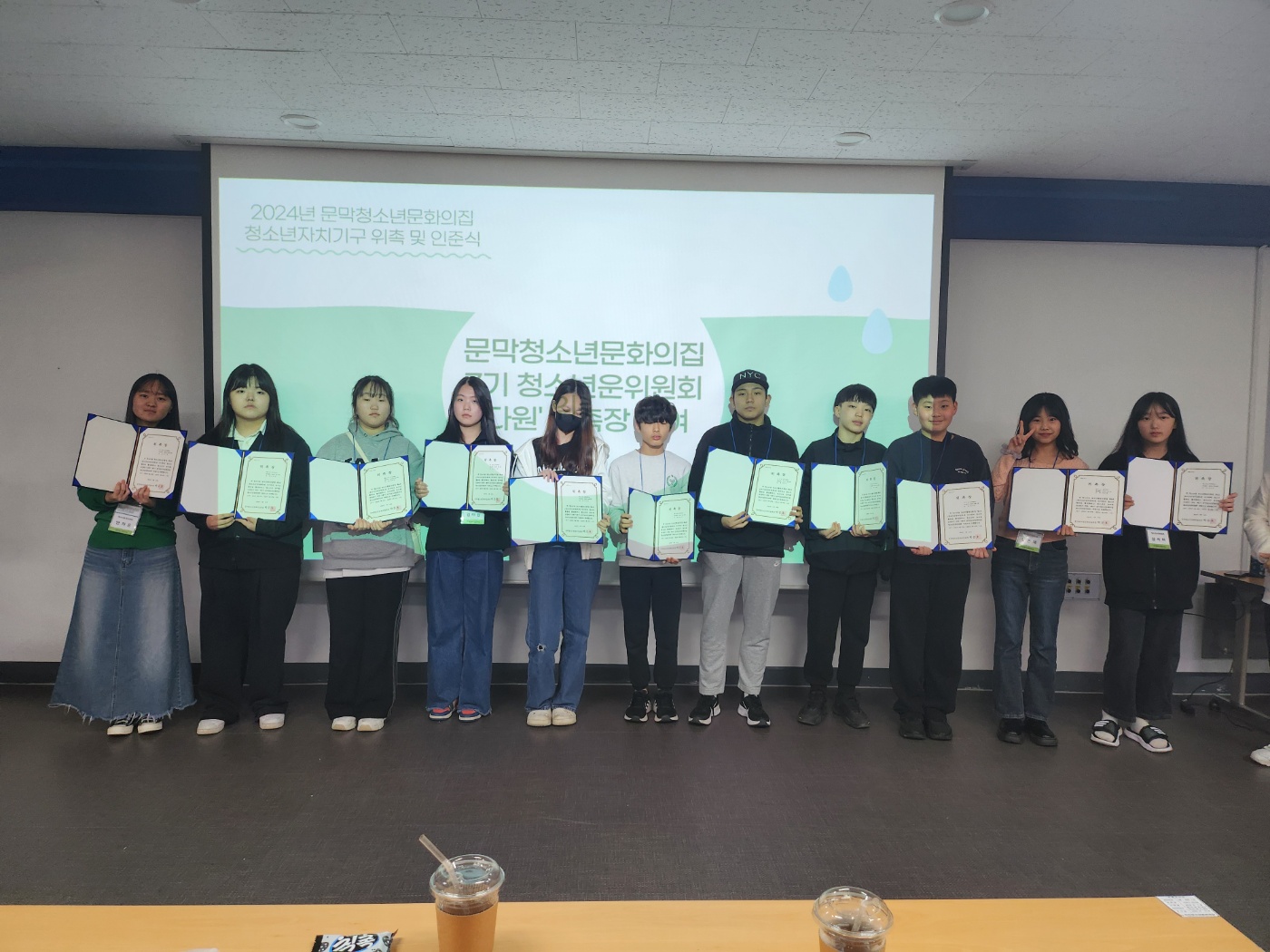 우선 문막청소년문화의집 대표 청소년 제7기 청소년운영위원회 위원들의 위촉장 수여와 문막청소년문화의집 동아리 인준기준으로 선정된 미술동아리 더휴, 탁구동아리 YOU.T.T, 밴드동아리 드림캐쳐, 댄스동아리 틴에이져, 도박예방활동단 단박단박에게 인준장을 수여했니다.