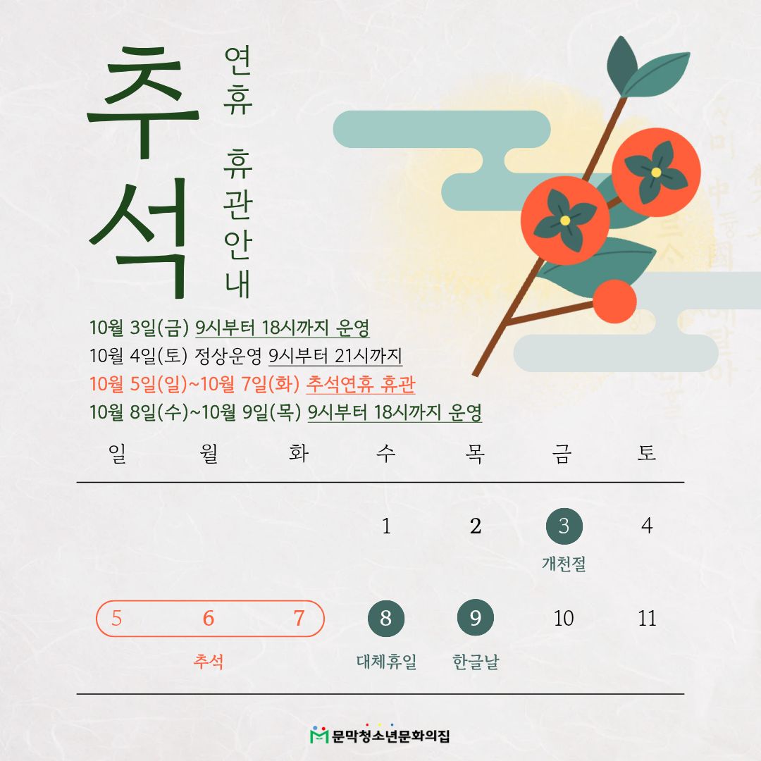 - 10월 5일(일) ~ 10월 7일(화) 추석 연휴 휴관