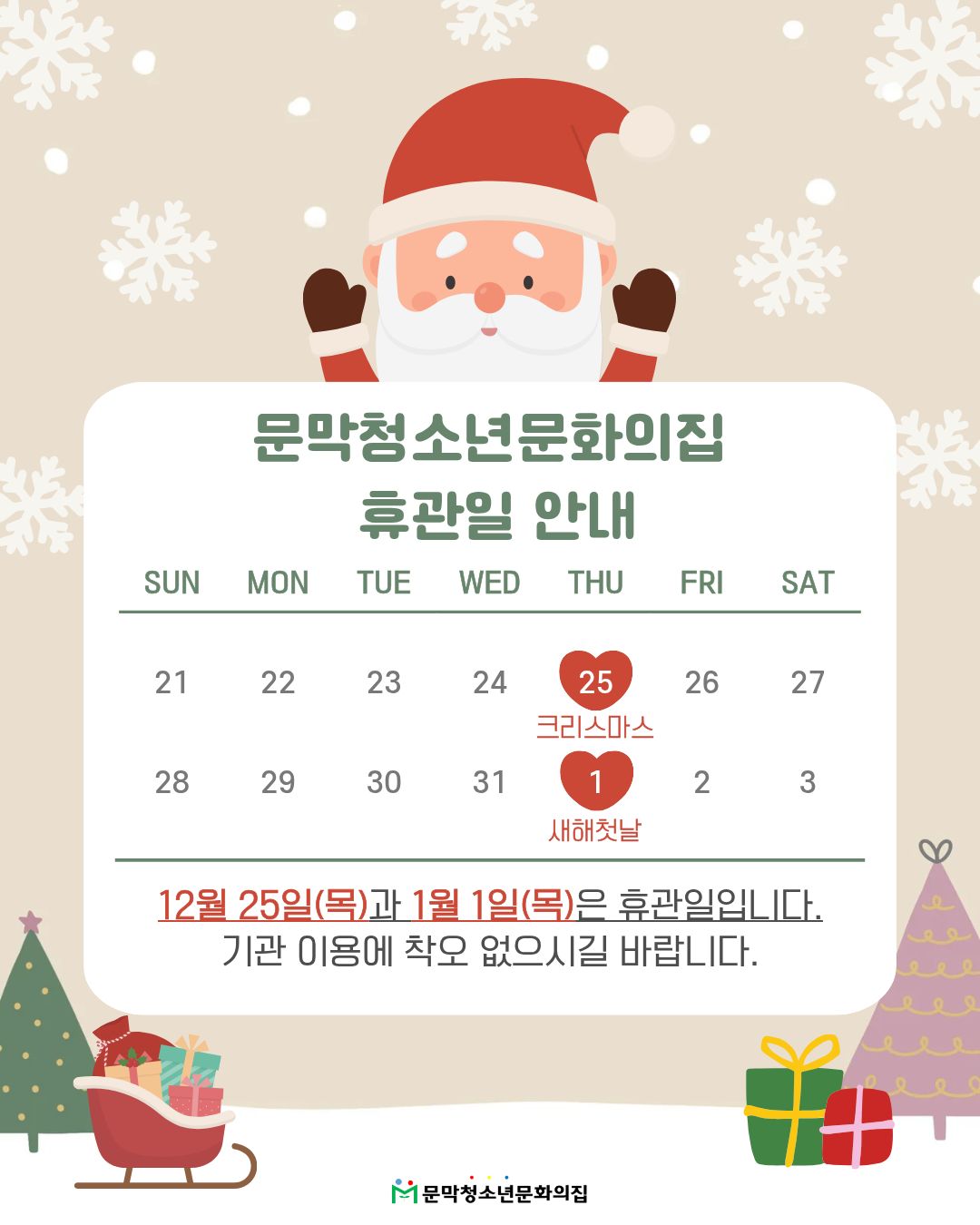 소개/대관안내 및 일정 휴관 안내 by 문막청소년문화의집 2025. 12. 24. 문막청소년문화의집은 크리스마스 및 새해 첫날을 맞아 아래와 같이 휴관합니다. 기관 이용에 참고하시기 바랍니다. 휴관일: 2025년 12월 25일(목), 2026년 1월 1일(목) 공유하기 게시글 관리 문막청소년문화의집 저작자표시 (새창열림) '소개 > 대관안내 및 일정' 카테고리의 다른 글 대관 신청 안내 (0) 2022.06.21 대관 일정 안내 (1) 2018.04.25 관련글 대관 신청 안내 대관 일정 안내 댓글